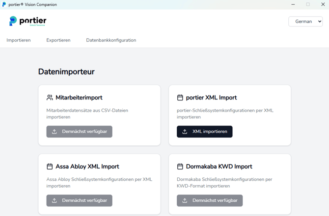 - Im "portier Vision Companion" gehen Sie zum Reiter "Importieren". Klicken Sie in der Kachel "portier XML Import" auf "XML importieren" und wählen Sie anschließend die XML-Datei aus, die importiert werden soll.
