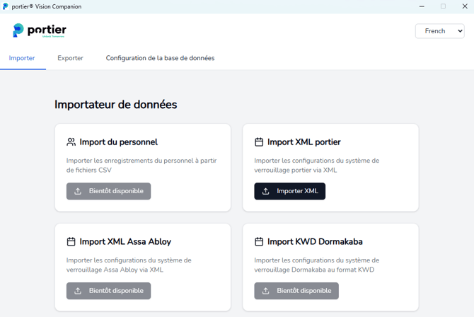 - Dans portier Vision Companion, ouvrez l’onglet Importer. Dans la tuile Import XML portier, cliquez sur Importer XML et sélectionnez le fichier XML que vous souhaitez importer.