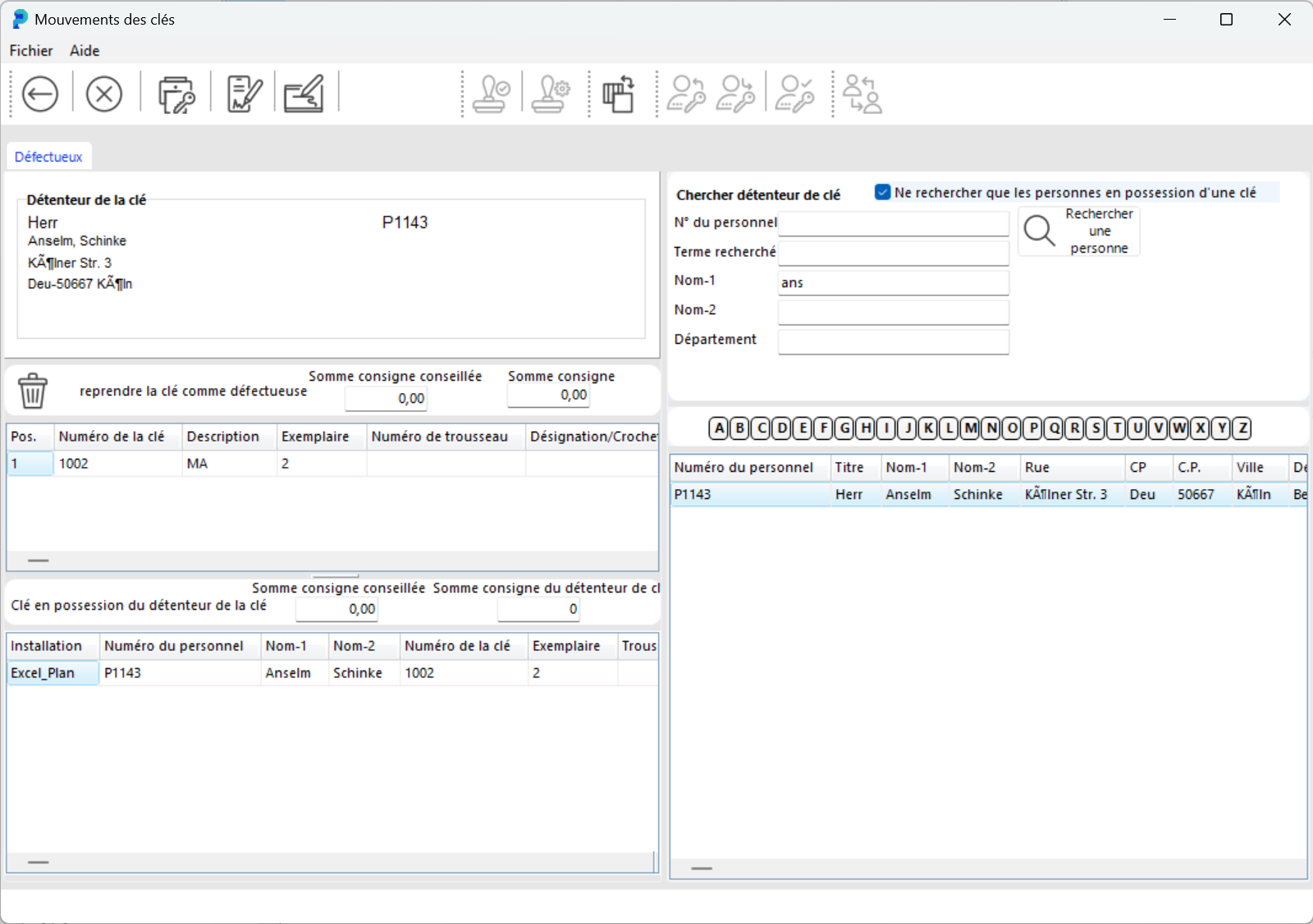 Saisissez les premières lettres du nom de famille du titulaire de clé dans le champ Nom - 1. Cliquez sur Rechercher personne pour afficher la liste des résultats.